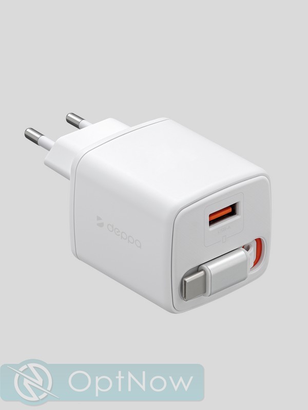 Адаптер питания Deppa USB-A + Type-C GaN QC 4.0+ 30Вт (11484) со встроенным кабелем Type-c, Белый