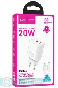 Адаптер питания Hoco N61 Gental PD20W+QC3.0 charger с кабелем Type-c to Type-c (Type-C+USB: 5В/ 3А, 9В/ 2А, 12В/ 1.5А) белый